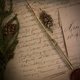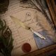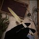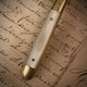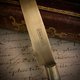刀體本身是屬於一體成型,上面有Stahl-bronce落款,刀柄兩旁使用珍珠母貝片固定,柄的左右兩邊,各有兩隻銅釘固定,柄背因為刀體是一體成型,所以也漏出金黃色了銅色,整體形成典雅的白金顏色。