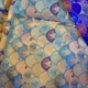 《錦浪瀲藍》使用的織錦緞布料,以多層扇形紋理交錯鋪陳,像細緻羽片堆疊,也像水面被風掀起後留下的漣漪。深藍、湖青、淡金與古銅色等線紗交錯織成,使布面在不同角度下呈現金屬般的亮面與陰影變化,視覺層次非常豐富。