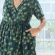 カシュクールデザインとウエストに入ったギャザーが女性らしさを引き立ててくれます。