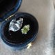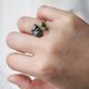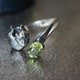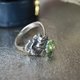 ほんわかと幸せそうに美しいカットのペリドットに寄り添って眠る猫の指輪。
