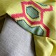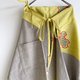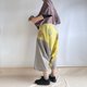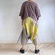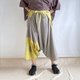 優しい履き心地の三角の形のパンツです。2種類の生地をたっぷりと使ってゆったりとした作りです。ウエストはチベタンスカートと呼ばれる形を参考にしたつくりです。脇の紐を結んでウエストを調節し、余った脇の布を前で結びます。脇の片側はボタンにしましたのでご自分のウエストに合わせてボタンの位置を調整していただくことも可能です。