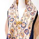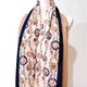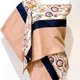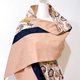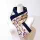 這塊日本米色底的印花布料非常可愛,像搖曳的柳條與錦簇的花團,讓人感受到猶如春日風光明媚、百花盛開的的喜悅。再絲質深藍古董布料映襯花布,和駝色柔軟的初剪羊毛融合。花布上點綴著乳白色的Swarovski燙鑽,隨著角度而隱約閃現光彩,像陽光透過葉尖灑落的靈動。古雅的配色讓心情溫暖平靜。三種不同的布料搭配可以利用摺、捲、繞的方式呈現多變的樣貌,非常適合喜愛素雅風格又有巧思的收藏者。
