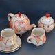 手工瓷茶具。 茶具包括一個茶壺、一個糖碗和兩個茶對(杯子/碟子)。 有趣的粉紅色大象形式的雕塑菜餚。 整個家庭! 大像用心形裝飾,碟子呈心形。 物品的功能與普通菜餚一樣。 此服務是在單個副本中創建的。 可以創建額外的茶對(杯子/碟子)。