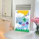 Things that make us happy—music, nature, love, luck, and flowers—come down in the sunlight. The rabbit reaching out seems to be trying to catch a dream.