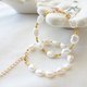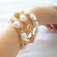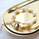 In these handmade bracelets, we use white freshwater pearl as the main material combined with gold beads and tri-colour beads(blue,yellow,orange). We use 0.6 mm copper wire to string everything together you could be bending to fit into the shape of the wrist.