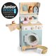 這是一款多功能兒童洗衣家家酒組,從洗、烘、燙到摺衣,一站式完成。附一個精緻藤編洗衣籃,用來收集髒衣物。洗衣機上方的洗劑盒可放入兩顆洗衣錠,按下按鈕即可開始運作,搭配兩個會發出喀噠聲的旋鈕,讓孩子選擇「洗程」與「脫水」轉速。