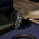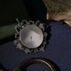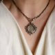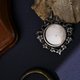 這只相片墜以純銀製作,後掀式開啟,可以放入照片等紀念物;這件作品有趣的是他的打印:圖中可以看見相片墜正中間有一個製作者打印、翻到墜子背面可以看到打印工具的痕跡--一個的正圓形打印敲痕。