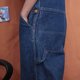 尖挺的丹寧布料,可乘載不少工具,吊帶褲的版型為因應當時工作需求,