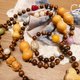 小葫蘆先打孔,再切割成小熊造型,刻上表情後,一顆顆細心串製。過程緩慢而繁複,有時一上午,也只能完成兩條。桌上散落的材料,反覆拆穿,只為了讓它更順眼、更耐用。
