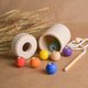 SIZES OF WOODEN EDUCATIONAL TOY FOR CHILDREN: All elements of a children's wooden toy are made taking into account the size of small hands. The wooden barrel has a length of 4.9 in. / 125 mm., and a diameter of 3 in. / 75 mm., there is a hole for balls in the removable lid of the barrel. The diameter of wooden balls is up to 1.2 in. / 30 mm. Wooden needle 3.9 in. / 100 mm. long. and a diameter of 0.4 in. / 9 mm. with a cotton cord ending with a special ball limiter.