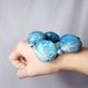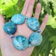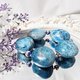 藍磷灰石滾石**體碩大器**,**近扁型**,可見藍磷灰石的**天藍、土耳其藍、紫羅藍、牛仔藍**等藍色調分佈,每一件皆宛若**抽象油彩畫作**,引人入勝。