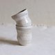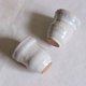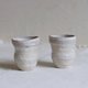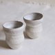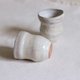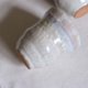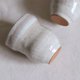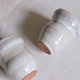 灰米白釉面有著斑駁的褐色花紋變化,其中夾帶著深色雜斑,搭配手捏的質地呈現器皿獨有的樣貌。杯內為霧白,微微透土色。
