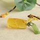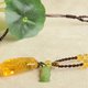 精選天然琥珀金絞蜜精雕竹節件,竹節絕大部分為透明金珀,晶瑩剔透的黃,如水晶般澄澈清透,內裡如同映照了一輪小小的太陽。在竹節中間偏左後部有淺淡一抹蜜意,如同陽光穿透形成的光影流動。雕刻精細,細節到位,竹節精緻,竹葉婀娜,搭配天然碧玉蘋果綠竹節雕刻件,碧玉精挑為精挑材質,料子干淨,無裂無雜無黑點,質地緻密細膩。滋潤光潔,略有色澤深淺變化,顏色過度自然柔和均勻。搭配天然琥珀金絞蜜,金珀圓珠,滿蜜圓珠,琥珀滿蜜四葉幸運草,天然綠瑪瑙小圓珠,整款項鏈有清麗又脫俗的風韻,清幽又雅緻的意境,清新又自在的悠閒,自用送人皆宜。