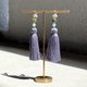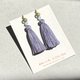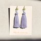 クレマチス(Clematis)をモチーフにしたイヤリングです。淡く輝くラベンダーグレーのタッセルはやわらかに揺れる花びらを思わせ、ゴールドグリーンのビーズは陽光を浴びた葉や茎の生命力を表現しました。