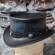 - 100% Genuine Full Grain Black Cowhide Leather. Sleek shiny finish with structured short crown. Embossed Leather Hatband with Western Texture Antique Silver Concho Accents