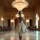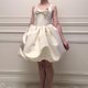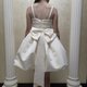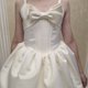 A luxurious cocktail dress made of ivory satin with a soft pearlescent sheen. The bodice has a corset cut, thin satin straps, and an elegant bow in the center of the chest. The upper part of the dress fits the figure smoothly and elegantly, emphasizing the clean lines of the silhouette. The skirt has a voluminous, rounded hem that ends just above the knees. The satin pleats beautifully reflect the light, adding depth and movement. At the back, a large sculptural bow with long cascading ribbons adds sophistication and charm.