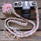 お花のような桜色の糸(ブロッサムヤーン)を使用した手作りの麻紐ヘンプカメラストラップです。