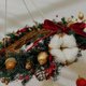 以永生雪松為聖誕花圈基底,運用永生繡球、滿天星、松果、胡椒果、永生玫瑰、棉花等(花材依季節而調整),並搭配聖誕球裝飾,設計出獨特的懸掛式花圈!