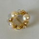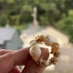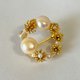 這款圓形胸針,使用天然巴洛克珍珠搭配透明水晶與細緻花蕊造型,彷彿花園中沾著露水的金色花環。