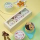 【新鮮食材】:進口發酵奶油、蛋、上白糖、海藻糖、麥芽、鮮奶油、海鹽、杏仁片、巧克力粉、金黃乳酪粉、菠菜粉、夏威夷豆、麵粉、覆盆子果泥、荔枝果泥、草莓果乾、蔓越莓果乾。