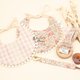 客製化商品內容物 : 短版蛋形圍兜 2 個 / 兔兔櫸木固齒器 1 個 / 英式奶嘴練 1 個 / 蕾絲奶嘴鍊 1 個 / 小髮夾組 1 組。