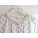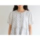 This top features ruffles around the neckline and down the center of the shirt, encircling the entire garment, including the back. It has puff sleeves and a front opening with functional buttons. The white shirt is adorned with a bouquet of floral prints and a light blue bow.