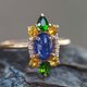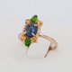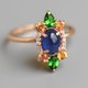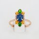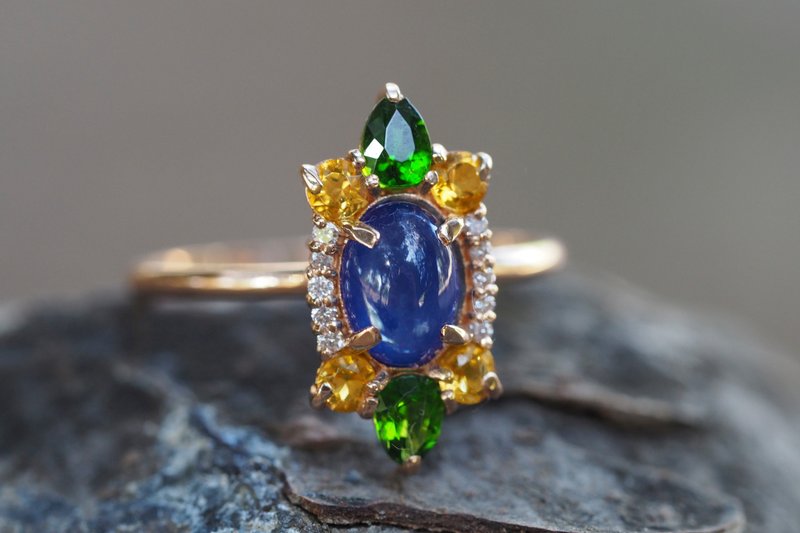 14k Gold ring with cabochon Sapphire, Chrome diopside, Sapphire, Diamonds.