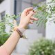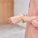 份量適中卻超可愛的簡約髮圈!用咲編包裹髮圈,深米色×杏桃色×抹茶綠的金木犀配色為髮型增添優雅點綴。附可拆卸珍珠吊飾,瞬間提升外出感。輕盈不占空間,搖曳生姿的珍珠散發上品氣質。也能當手環配戴,用途多元讓每天造型更有趣!