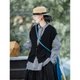 一件披肩式的馬甲,扣合與解開都是好看的模樣,深V領,開門襟,幾粒紐扣固定。衣服的大身結構鋪來平面是比較橫平豎直的,腋下的固定通過兩粒扣來固定。遇到襯衫腋下寬松的,可以解開馬甲一粒,讓線條更鬆弛,不會出現卡腋下的現象。當然也可以當作小披肩,解開腋下紐扣,披在肩上,法式小浪漫。