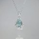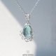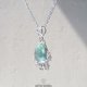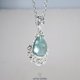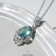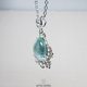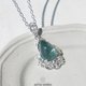 深みのあるブルーグリーンに内包物が映えるモスアクアマリンを、ボタニカルなイメージの透かし模様の台座にセットしたペンダント。