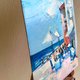 This beautiful original painting by Elen Iv captures the charm and light of the Italian Riviera. Painted with a palette knife in vibrant shades of blue, pink, and white, it depicts a seaside café bathed in sunlight, with the shimmering sea.