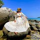露肩款式,袖子飾有荷葉邊細節