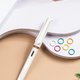 LAMY 2025亮白色ABS筆身/筆蓋,同色系白色迴紋針造型筆夾,人體工學亮面前端握把,筆蓋頂端是裝飾六色環色彩圖樣,鋼筆筆桿上原有同色調的筆環外,禮盒內另外配有六種不同繽紛色彩筆環,搭配不銹鋼銀色筆尖,可使用Z28吸水器或T10卡水
