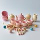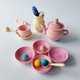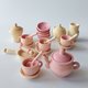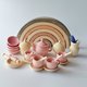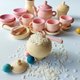 We invented colors and painted this set of dishes by hand. Ware wooden. Linden tree. Varnish safe.