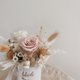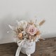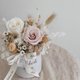 日本大地農園頂級永生玫瑰花(白&淺褐色)、日本大地農園頂級永生繡球花(白&香檳色)、永生白色蓬萊松、白色亞麻果、義大利法國白梅、膚色加那利 、白色木滿天星、原色兔尾、木片米色小雛菊