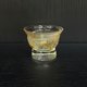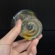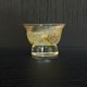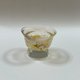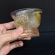 這件作品寬約7.5公分、高約6公分,重量約224克。整體以淺黃為底,褐色玻璃紋線不規則散佈於碗內側,形成流動感。開口略寬,底部為高腳台座設計,推薦放在木質層板、托盤或玄關櫃角落,營造溫和而質地豐富的畫面。