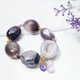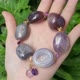 設計師歷時、費心、淘選冰潤**藍紫色瑪瑙(玉瓍)**體材碩大之滾石,件件能見藍、紫、紅、白色交織纏絲紋、雪花紋、抽象油畫感等多種紋理,並有**聚寶盆晶洞,增添配戴美觀度,賞玩趣味性十足**。