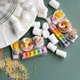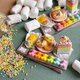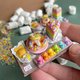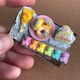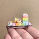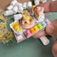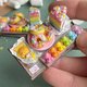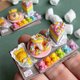 - Miniature - a set of desserts a piece of rainbow cake with colored sprinkles, a plate with colorful donuts and marmalade bears. All parts are fixed with glue. Polymer plastic, acrylic paints, acrylic varnish and cardboard are used as materials for manufacturing.