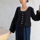 蓬鬆的袖子與一整排的貝殼鈕釦是此款的特色。