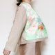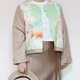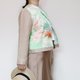 フロント部分にはヴィンテージの着物地を使用し、淡いグリーンを基調とした花々のデザインが爽やかで上品な印象を与えます。