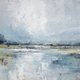 《雨霽》屬於「自然詩境系列」,以低飽和灰藍色描繪雨後初晴的地平線。厚塗般的筆觸在畫面上交錯堆疊,將天空、遠山與水面的光影抽象化,彷彿雨絲尚未全然散去,空氣卻已變得清澈而安靜。