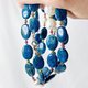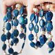 **藍銅礦**手工磨製稀有**橢圓扁珠**型,**高瓷度**,色彩呈現**靛藍、蒼藍、碧藍**等舒心藍色調,可見共生的**絲絲細膩孔雀石綠、冰透玉化紋**,每一枚藍銅礦宛如畫布,紀載大地母親孕育億萬年的紋理。