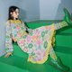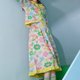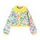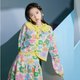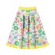 圖案由多種原創形狀和配色的花朵組成 加有紋理工藝的方領上連接同色花邊 松緊腰頭方便穿脫 裙身為拼接設計 底邊連接純色螺紋花邊與腰頭呼應