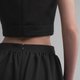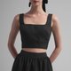 短版上衣,剪裁修身,採用方領設計,展現鎖骨線條