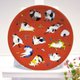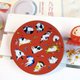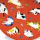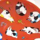 紅色盤面上聚集了 10 隻胖胖的貓咪,各種花色、以臥姿慵懶地攤在盤中。空白處點綴著小魚乾、逗貓棒、毛線球,彷彿貓咪們隨時要玩耍或打盹。