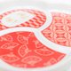 紅色達摩盤則結合「扇子(末廣)、矢絣(Yagasuri)、花菱文」。扇子寓意展開未來、運勢展開;矢絣代表堅定不移的心志;花菱文則傳達高雅與吉祥繁榮。