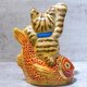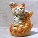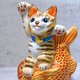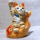 牠配戴著藍色項圈和金色鈴鐺🔔,坐在色彩鮮艷的紅色與金色錦鯉魚🐟上,象徵吉祥與財富。