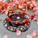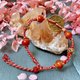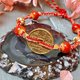 手鍊的設計融合了赤紅色的燒陶珠,這種鮮豔的色彩搭配寓意吉祥、避邪之意。手工編織的過程中,巧妙地運用了手搓棉線與玉線的混搭,使整體的視覺效果更加生動,不僅有古典紅色的莊重,還因為黃色與藍色的細點而增添了活潑感,讓佩戴者散發出自信與魅力。