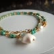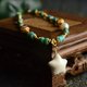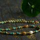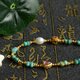 邊緣處理圓潤,搭配一顆淡水珍珠泛著微光,柔和含蓄,與綠松石的清冷形成巧妙對比。 兩枚鍍金碧璽鏤空鑲嵌件分別呈水滴形與方形,碧璽色彩多樣,或明豔或溫柔,精美細致又富貴明媚。所有珠飾之間均以鍍金隔片和小圓珠間隔,金屬點綴低調卻不失精緻。