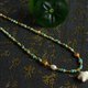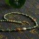 項鏈採用原礦綠松石雕刻成的小小骨節做主體,件造型玲瓏,線條流暢,藍綠色調清新雅緻,瓷度極高,表面光滑細膩。以高瓷綠松石圓珠延續至鏈尾,色調層次豐富,從淡藍、淺棕到灰藍,深棕色調交織,散發溫潤柔光。